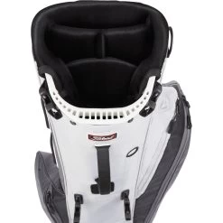 Der weich gepolsterte Doppeltragegurt ist individuell einstellbar und verspricht hohen Tragekomfort. Bei Bedarf lässt er sich einfach mittels Steckverschlüssen abnehmen, sodass sich das Bag ohne sich irgendwo zu verhaken verstauen lässt. Dabei helfen günstig platzierte Griffe an Top, an der Oberseite und im unteren Bereich. Die Standautomatik aus Karbon ist stabil und gleichzeitig sehr leicht, sodass das Gesamtgewicht des Bags im Vergleich zu anderen Standbags drastisch reduziert wird.